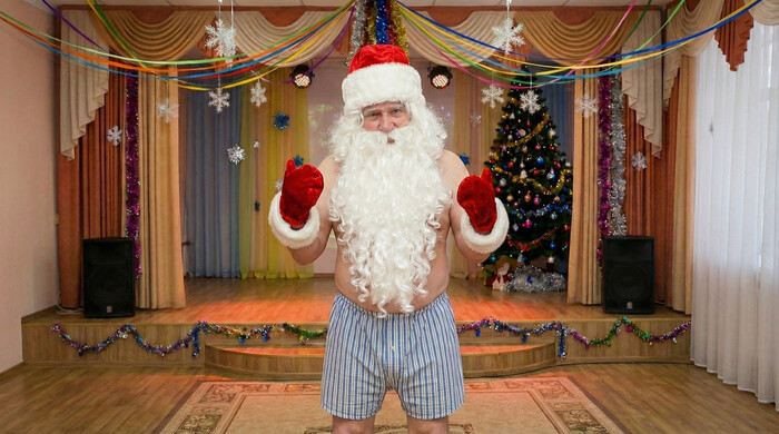 Идея (промпт в боте): фото деда мороза который одет только в эти вещи, стоит на сцене утренника