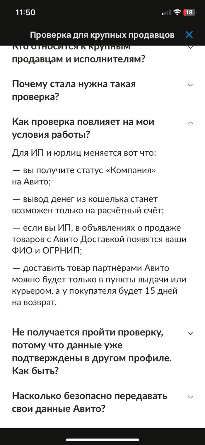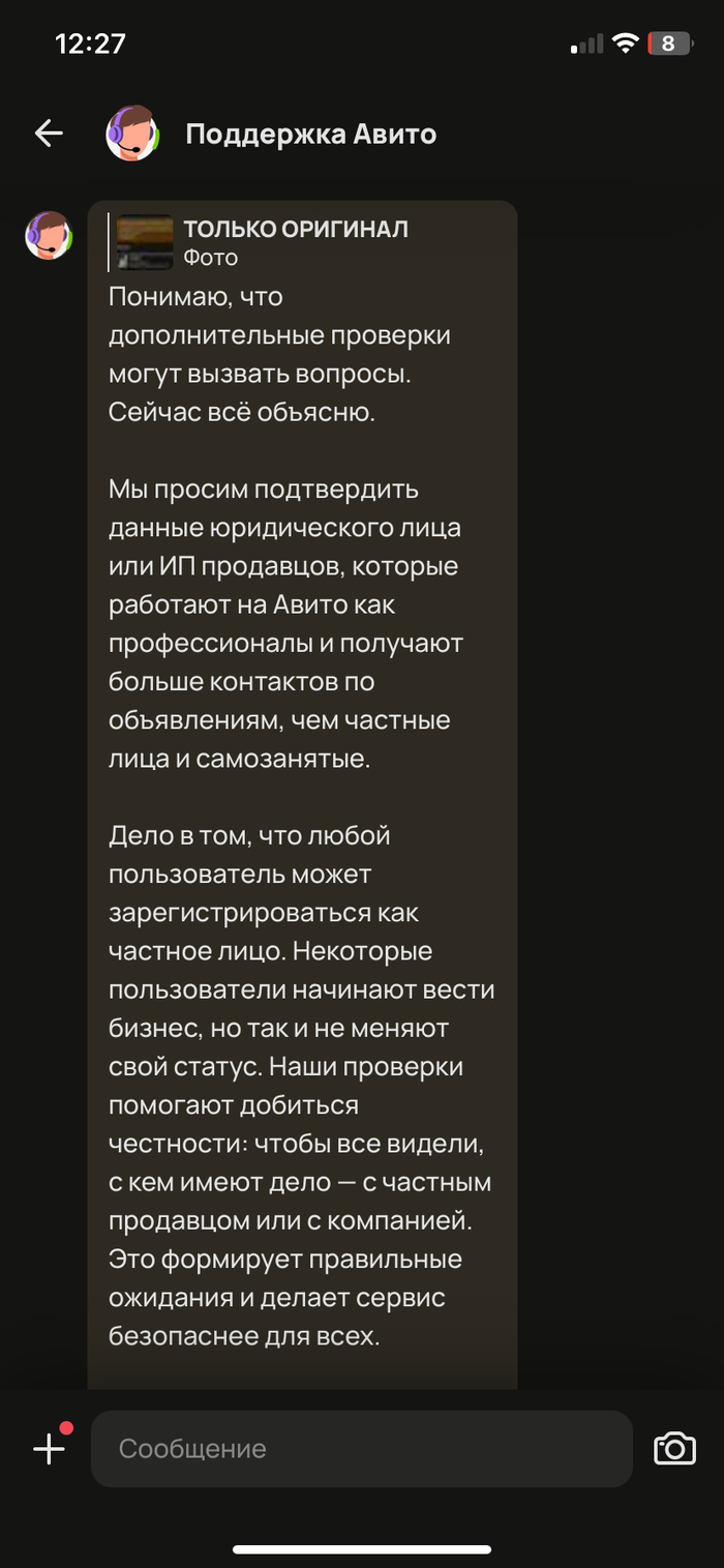 Всем привет! Занимаюсь авито 3 года. Профиль с подтвержденными документами. Продаю винтажные вещи и аксессуары. Стараюсь находить что-то действительно интересное. Продажи не большие, до 10 вещей в месяц в среднем, для меня это что-то вроде хобби + небольшой доп доход. Недавно выложил 2 куртки по очень низкой цене, т. к. срочно понадобиться деньги, и мне написало больше людей чем обычно. Не удивительно - сезон. Дальше началось самое интересное! Пришло уведомление ❗️❗️❗️ПРОЙДИТЕ ПРОВЕРКУ КАК ЮР ЛИЦО ИЛИ ИП ❗️❗️❗️. Написал в поддержку -получил такой ответ. Смотрите, вы получили значительно больше контактов, чем обычно получают частные лица или самозанятые, поэтому разместить большее количество объявлений без проверки не получится. Если вы не пройдёте проверку в указанный срок, опубликованные объявления останутся активными — товары можно будет продолжать продавать. ❗️❗️❗️Но если у вас уже есть 15 активных объявлений, добавить новые не получится.❗️❗️❗️При попытке разместить ещё одно появится уведомление с предложением пройти верификацию для юридических лиц и ИП. Значит если у тебя просмотры = делай ип или юр лицо 👍👍👍 Я думаю это коснется многих😩 Вот такие чудесные правила. (Максимум 15 объявлений) Но это ещё не все, если вы это сделаете, то окажитесь в ещё более жестких рамках: ❗️❗️❗️Вы получите статус «Компания»на Авито;— вывод денег из кошелька станет возможен только на расчётный счёт;— если вы ИП, в объявлениях о продаже товаров с Авито Доставкой появятся ваши ФИО и ОГРНИП;— доставить товар партнёрами Авито можно будет только в пункты выдачи или курьером, а у покупателя будет 15 дней на возврат❗️❗️❗️ Авито! Уберите меня из этого списка! Я не крупный продавец и продаю б/у вещи! Ваш ИИ ошибается в выборе жертв. Вот ссылка на мой профиль: https://www.avito.ru/user/7671e0405b4f3482e3bb9334cf925458/p...
