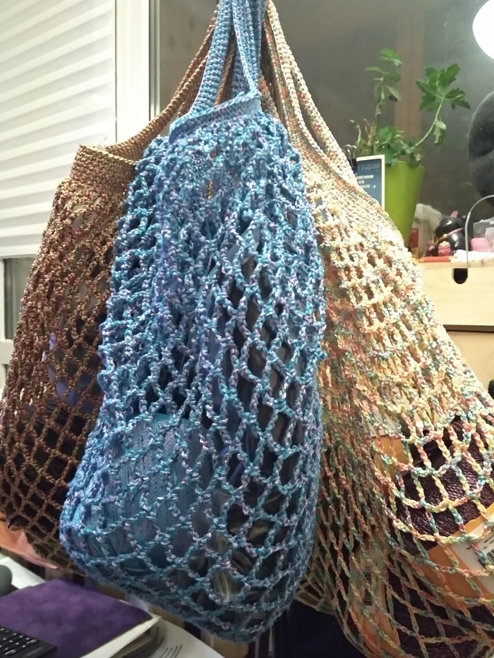 Я снова за своё. Отложив ненадолго в сторонку шарфы, я в сумасшедшем темпе ваяю к Женскому дню кокетливые весёлые авоськи из Семёновской пряжи.