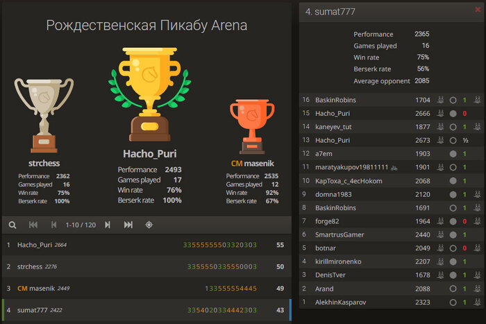 Что касается конкретно Hacho_Puri, то он знатный хитрец! Он не стал выигрывать все партии подряд, чтобы не вызвать подозрения. Он просто сделал такой результат, чтобы гарантировать себе первое место и не более того.