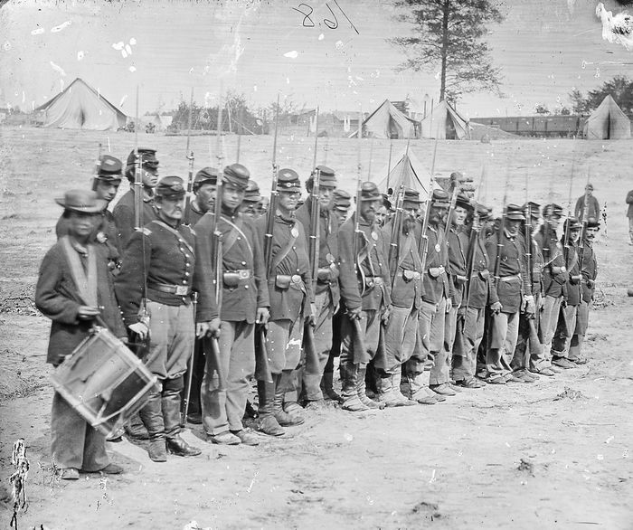 Афро-американские солдаты отдыхают при высадке Айкена, штат Вирджиния, около 1865г.