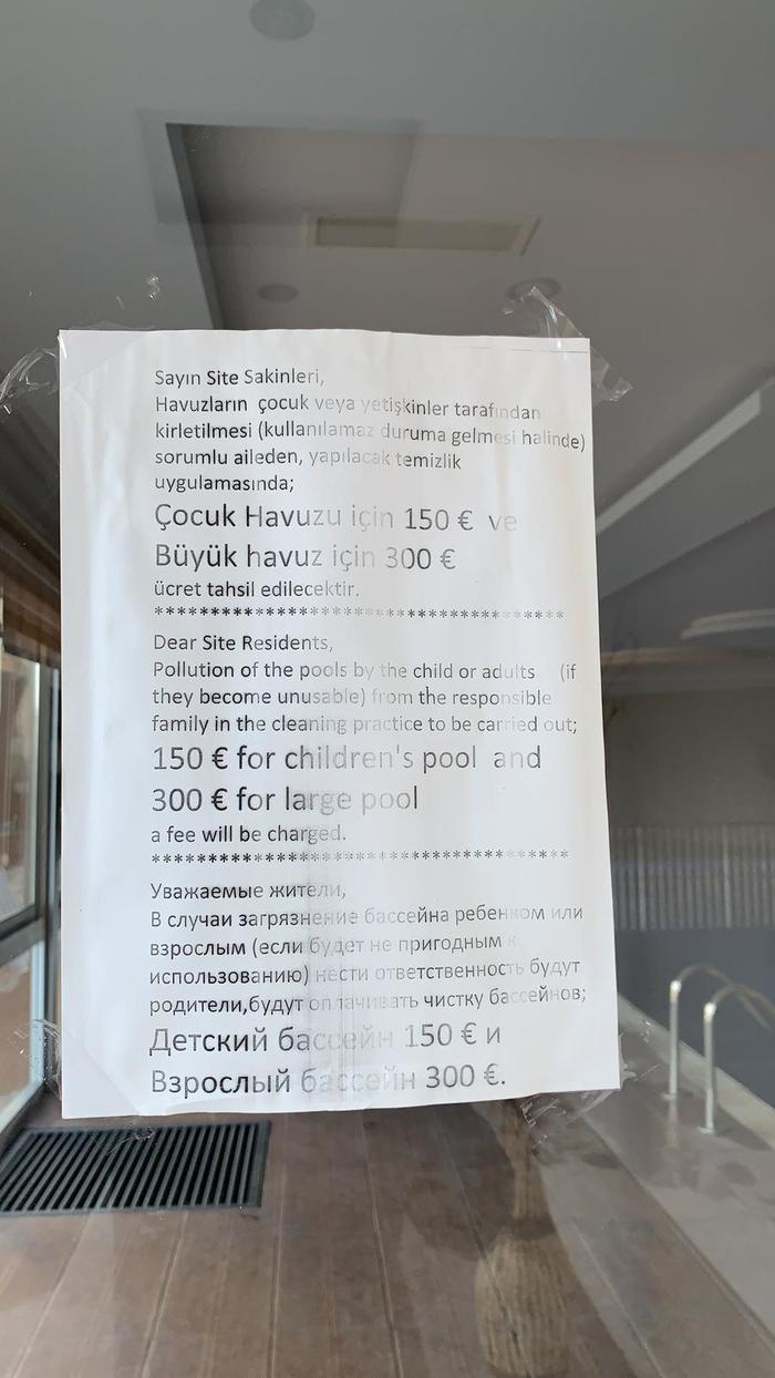 Дело в том, что один из совладельцев, нет не славянин, европеец, обрыгал крытый бассейн так, что его пришлось закрыть. Хотели оштрафовать, но оказалось, что в Турции нельзя оштрафовать жильца за загрязнение комплекса. В результате решили просто припугнуть повесив это объявление.