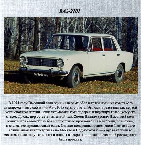 В 1971-м году Владимир Высоцкий стал обладателем светло-серой «копейки», которую ему подарил отец. К сожалению, и на этой машине Высоцкий ездил совсем недолго. По легенде в один из жарких июльских вечеров актер поспорил с соседом владельцем аналогичных «Жигулей». И чтобы разрешить спор они выехали на дорогу. Мужчины договорились, что проигравшим в споре окажется тот, кто раньше свернет с дороги при езде лоб в лоб. Смельчаками оказались оба, поэтому сразу две «копейки» в тот вечер были разбиты всмятку. После того как Высоцкий отремонтировал ВАЗ 2101, он переоформил машину отца на себя и сразу же сдал ее в комиссионку, а следом стал обладателем первой в своей жизни иномарки.