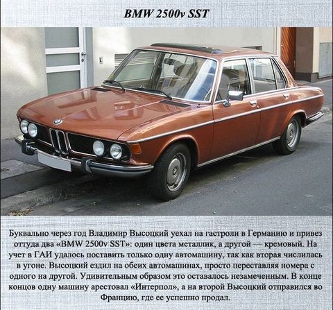 Второй иномаркой, которую себе приобрел советский поэт-песенник, стала BMW 2500. Владимир Семенович пригнал себе эту машину из Германии во время одного из своих первых европейских гастролей. Причем, поговаривают, что у Высоцкого было два таких автомобиля. Второй экземпляр в не очень хорошем состоянии он якобы купил уже в московской комиссионке в качестве донора запчастей для своей основной машины. Ведь в те годы в СССР с запчастями на иномарки было действительно туго. По одной из легенд эта машина числилась в угоне и позднее даже была конфискована у Высоцкого по линии Интерпола. Так или иначе, от своей BMW Высоцкий избавился 1976-м, когда всерьез «заболел Мерседесами».