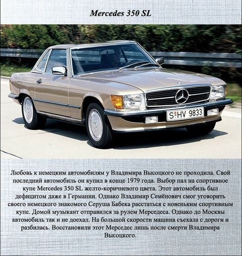 Впрочем, 116-й был не единственным «Мерседесом», которым владел Высоцкий. В 1979-м году после очередных гастролей в Европе Высоцкий купил у своего приятеля, иранского бизнесмена Бабека Серуша, крайне редкий спортивный Mercedes-Benz 350 SLC. Впрочем, этим купе Высоцкий так и не смог удивить Москву. Актер разбил 200-сильный автомобиль золотисто-коричневого цвета еще по пути домой. Поэт попал в аварию, уложив машину в кювет, на тогда еще строящейся к Олимпиаде-80 скоростной трассе под Минском. Более того, 1 января 80-го Высоцкий попал в еще одно небольшое ДТП и на своем S-классе, слегка приложив его об троллейбус. Правда седан, в отличие от купе SLC, успели починить до смерти актера, и он на нем успел поездить еще какое-то время. Ну, а спортивное купе было восстановлено уже после смерти Высоцкого. И Марина Влади забрала его с собой в Европу, поэтому дальнейшая судьба этого автомобиля не известна.