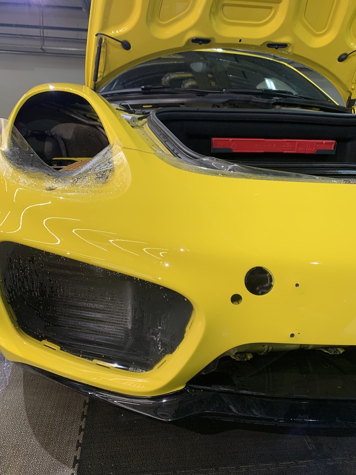 Оклейка капота в полиуретан SUNTEK. Целлофан на лобовом закрывает часть подкапотного пространства, предотвращая попадание пыли под пленку.