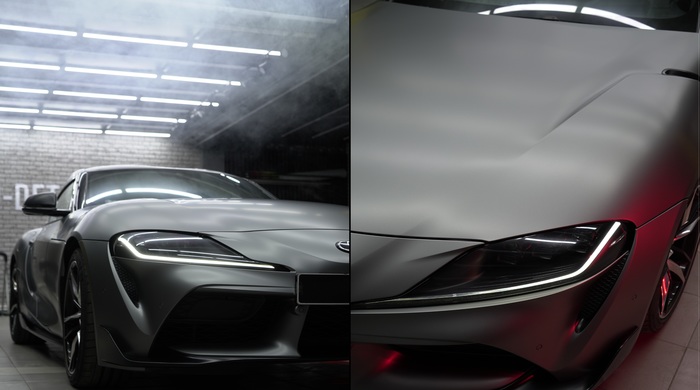 По окончанию работ с винилом, обращаем внимание на глянцевые элементы: фары и стойки лобового. Прячем их под защиту полиуретановой пленки.