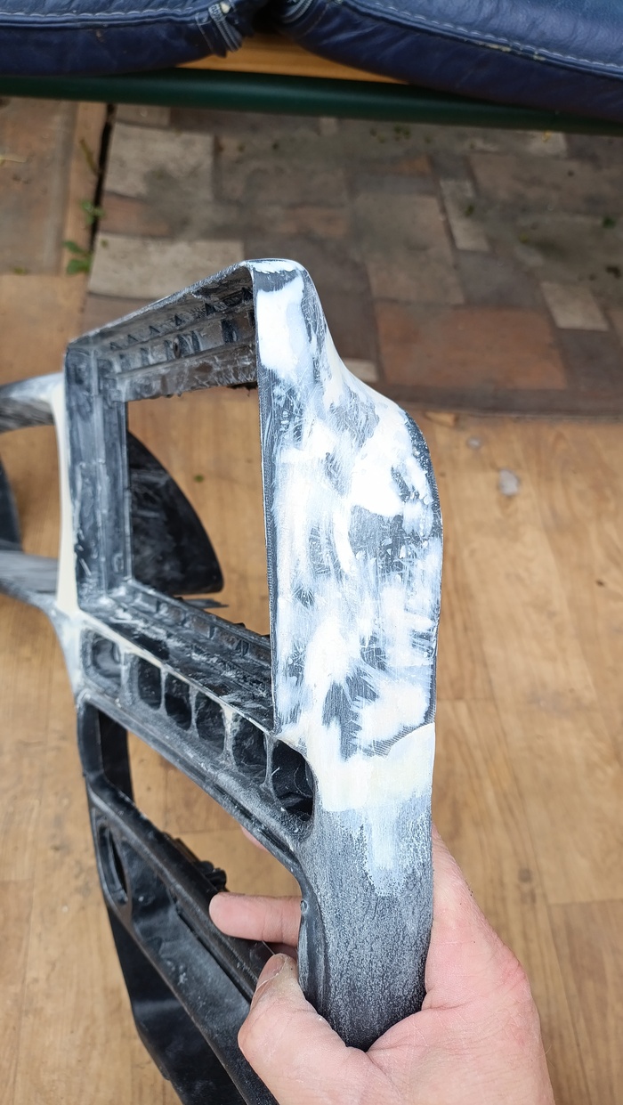 Ну а дальше снял панель, после отвердевания эпоксидки. На следующий день все обильно смазываем шпаклей и упорно забываем Мальвину трем шкуркой. Повторить при необходимости. В дырку от от бортового компьютера вставил 2 пластинки пластика, посадил на космофен. Зашпаклевал.