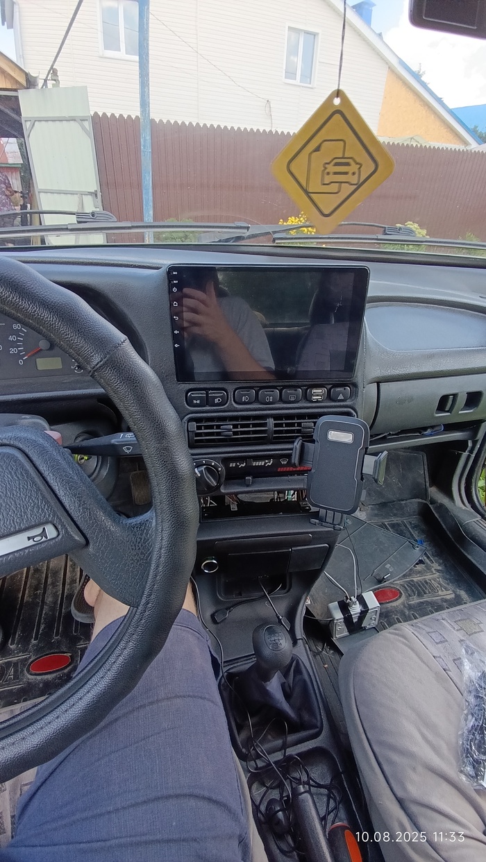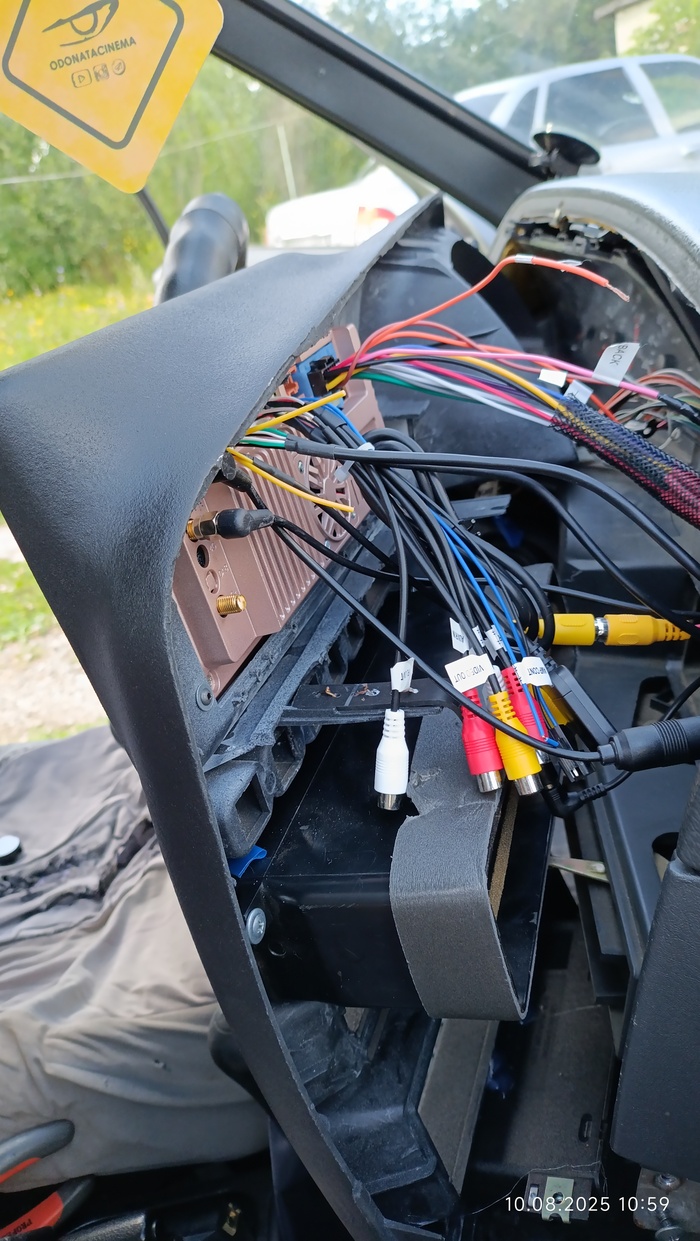 Прикрутил магнитолу, собрал все до состояния - можно ездить. Все равно придется несколько раз еще снимать. За кадром установил камеру заднего вида, что шла в комплекте с шарманкой.