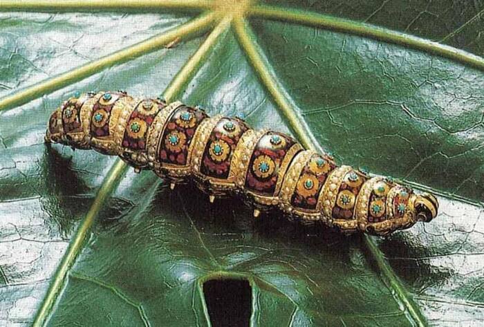 Гусеница длиной 7 сантиметров, изготовлена из золота, украшена чёрной и красной ювелирной эмалью, инкрустирована жемчугом, бриллиантами, изумрудами и рубинами.