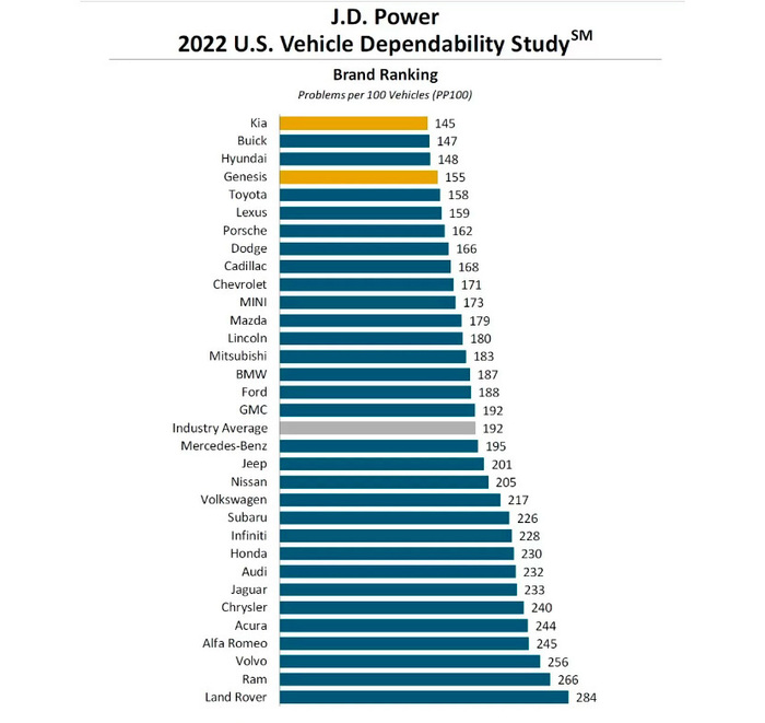 Исследование 2022 года основано на проведенных в период с июля 2021-го по ноябрь того же года опросах без малого 30 тысяч американских пользователей, эксплуатирующих автомобили-трехлетки, то есть которые были куплены в 2019 году, и фиксирует количество проблем, с которыми они столкнулись. Из полученных ответов сформировался рейтинг PP100, показывающий количество выявленных проблем на 100 автомобилей.