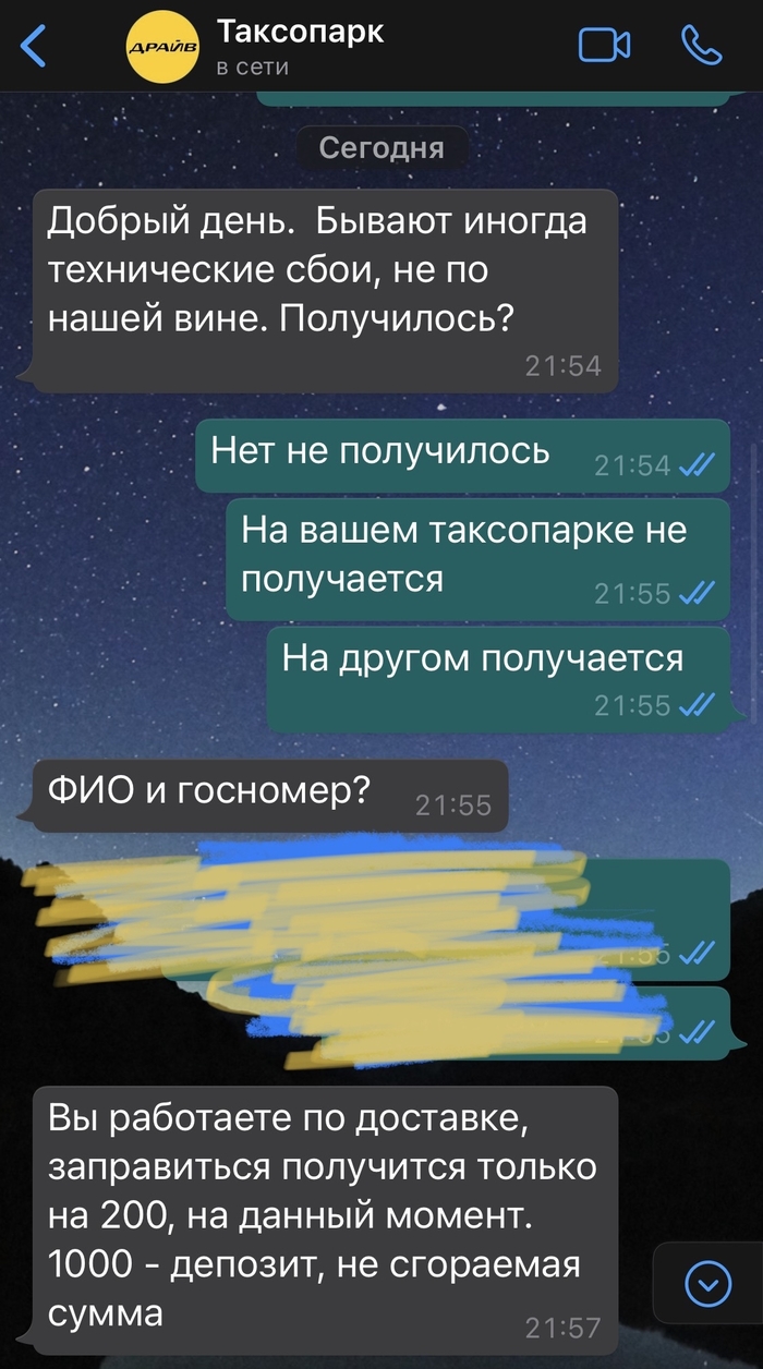 Вечером снова написал в ватсап таксопарка «драйв» что мол так и так, не смог… начались отговорки, проблема не у них… я сказал что другой таксопарк меня заправил без проблем… тогда они переобулись и дальше вы всё увидите на скриншотах…