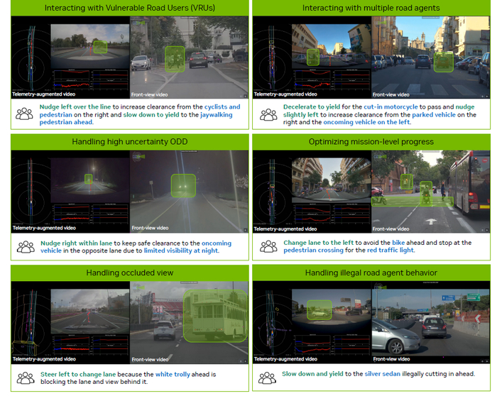 Задействованная архитектура VLA принимает на вход данные с четырех камер (фронтальной широкоугольной, телеобъектива и двух боковых) с историей в 0.4 секунды и основана на языковой модели Cosmos-Reason для рассуждений и диффузионном декодере для построения траекторий в реальном времени. Обучение модели началось с тонкой настройки на данных CoC, а потом применили обучение с подкреплением для согласованности рассуждений и действий.