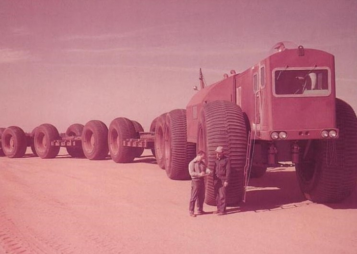 К тому времени ЛеТурно уже подготовил следующую модификацию полярного автопоезда YS-1 Army Sno-Train. Силовая установка осталась без изменений, диаметр колёс увеличили до 3.5 метров, а грузоподъемность платформ — до 45 тонн каждая. Локомотив оснастили полноценным жилым модулем и даже стильным плексигласовым колпаком на крыше для… Да какая разница для чего, круто же!