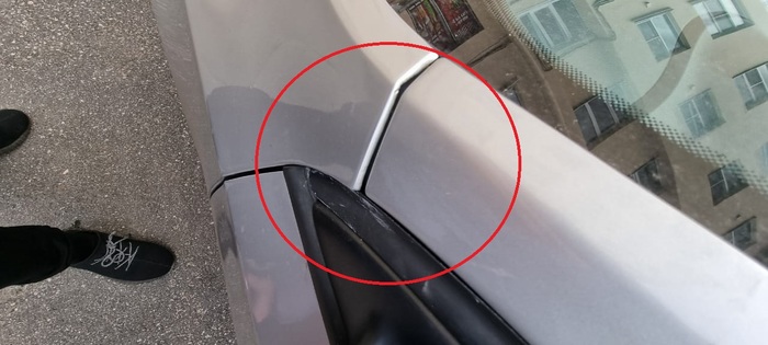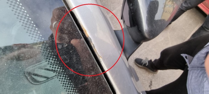 Нуу если на первом фото я думаю всем понятно, что зазор крыла просто ужасен, а ещё резинки вместе с ним покрасили. То для второй фотки нужна пояснительная бригада. Если кто-то не понял, то это стойка передняя, а на ней типа клей для вклейки лобового, правда только в этом месте, и рядом лопнула шпакля, полезла ржавчина из под неё, рискну предположить, что это было сделано уже после ремонта и потому, что в салоне пытался пойти дождь)