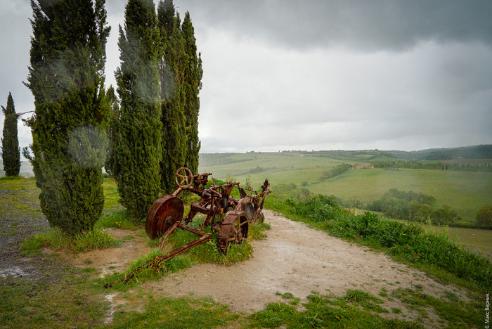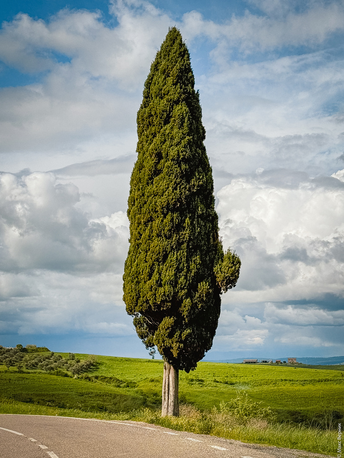 В итоге я вернулся в машину, всё высушил, переждал дождь и щёлкнул очередную точку, вот то одинокое, стоящее слева, дерево на холме – как говорилось во всех путеводителях – одно из самых фотографируемых мест Тосканы.