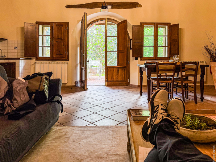 Первая точка оказалась прекрасным среднетосканским сюжетом: холм, трёхсотлетний каменный особнячок в тёплых тонах на нём, перед ним ровный ряд кипарисов, позади домика терраса, винный погреб и вид, от которого любой нормальный человек задохнётся, пытаясь осознать, куда попал, а итальянец... он просто будет чистить ногти перочинным ножиком и восхищаться чужими жизнями в инстаграм-ленте.