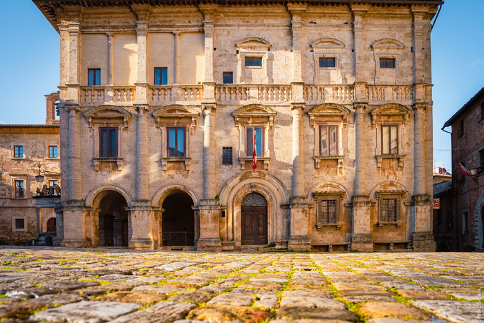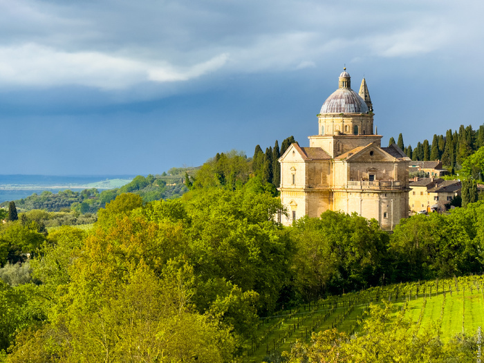 Ещё до самого города вас встречает церковь Сан-Бьяджо — чистый, гармоничный шедевр Высокого Возрождения. Стоит посреди полей так уверенно, будто всегда тут была и никуда не собирается.