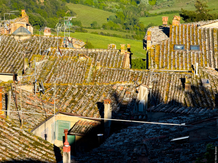С балконов, выступов, везде по кругу этого небольшого винного рая эпохи Возрождения открываются умопомрачительные виды на волнистые поля и виноградники Тосканы. Седые крыши, истерзанный камень, скрипящие ставни и бельё, хлопающее на всех уличных верёвках, дугами соединяющих дома. Это был провинциальный, тихий Монтепульчано, который, приглашающе раскрыв свои объятия, предложил свою дружбу и сердце, а мне только и оставалось, что их принять.