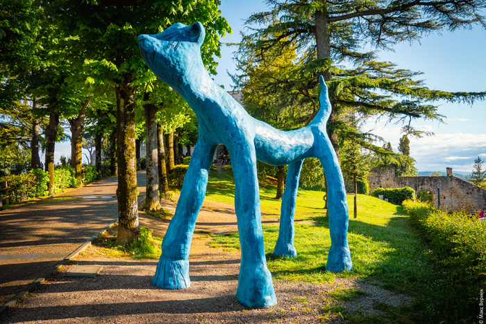 Парковка — 2 евро в час. Мест почти нет. А над парковкой — небольшой парк и странный, небесно-голубой кот в наивной манере скульптора Карин Грудды. Пластилиновый, тёплый, дружелюбный. Как будто намекает: расслабься, тут всё будет хорошо.