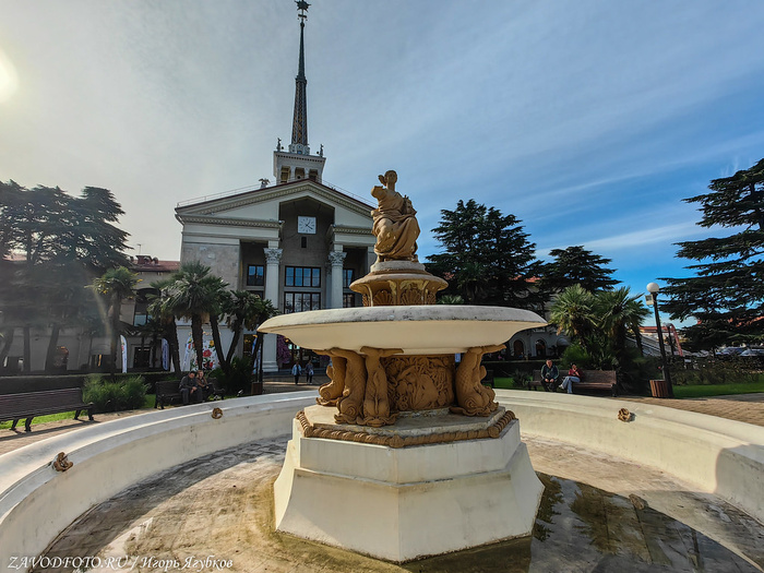 В сквере перед Морским вокзалом стоит скульптурный фонтан «Владычица морей». Над чашей возвышается женская фигура, в одной руке она держит лоцию, в другой корабль.