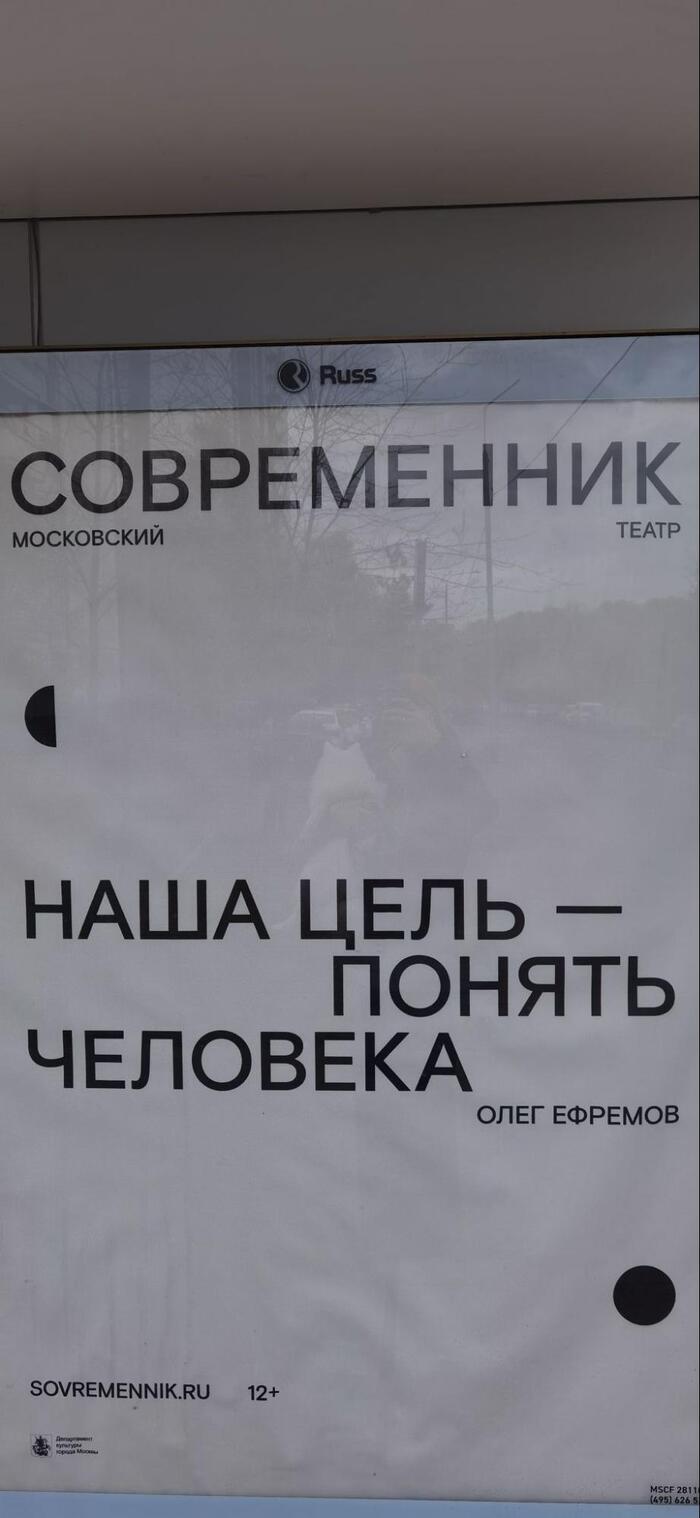 Однажды я вышел гулять с собакой и на автобусной остановке наткнулся на плакат с цитатой Олега Ефремова: “Наша цель — понять человека”. Даже вот фото есть: