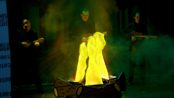 Записывал я музыку в двух вариантах: чисто инструментал, который звучал затем на спектакле, и второй вариант, где я поверх пою все партии, чтобы дирижёр хора и актёры ориентировались в материале. Делать ноты не было времени. И да, есть версия оперы, где я пою всё по ролям, но вы не хотите это слышать.