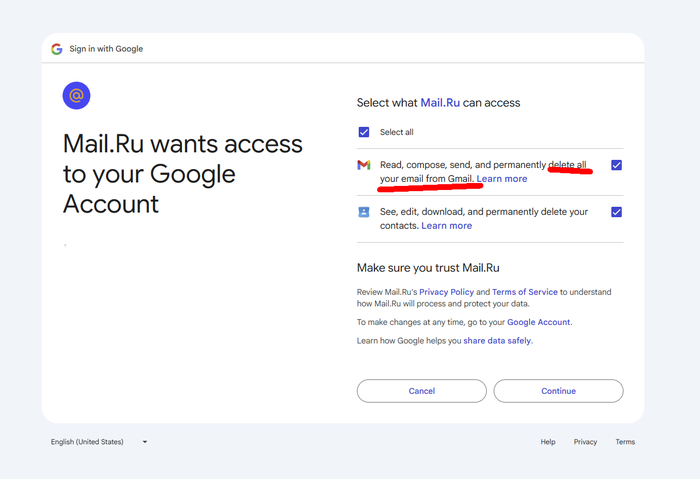 Хотел попробовать VK Workplays. При регистрации VK попросил дать ему доступ ко всей моей почте, включая полное ее удаление.