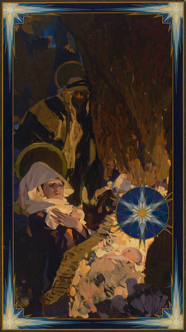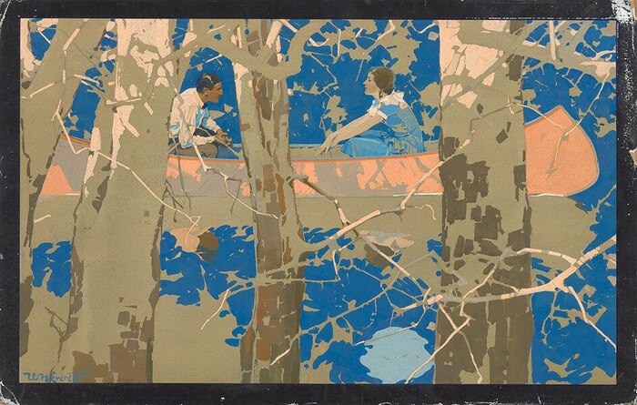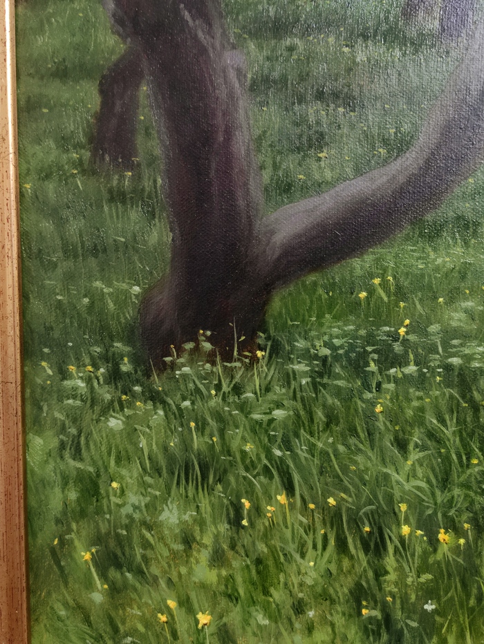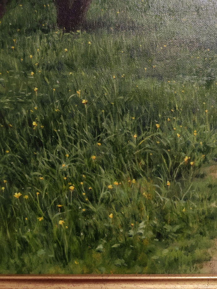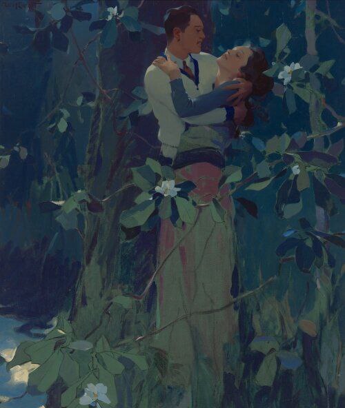 Окружающая среда обыденна и в то же время сказочна, стоит только посмотреть на задний план с его сказочными птицами на насыщенном синем фоне, словно это часть его сна, его фантазии.