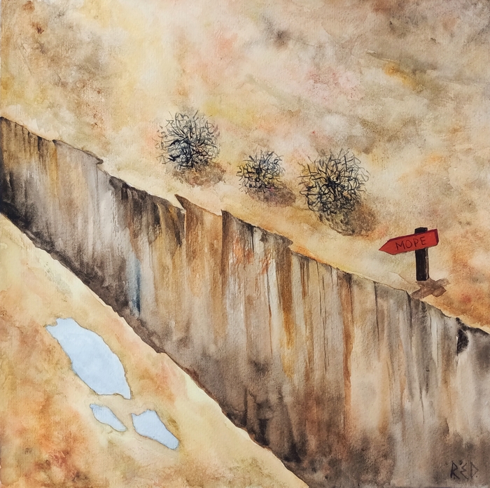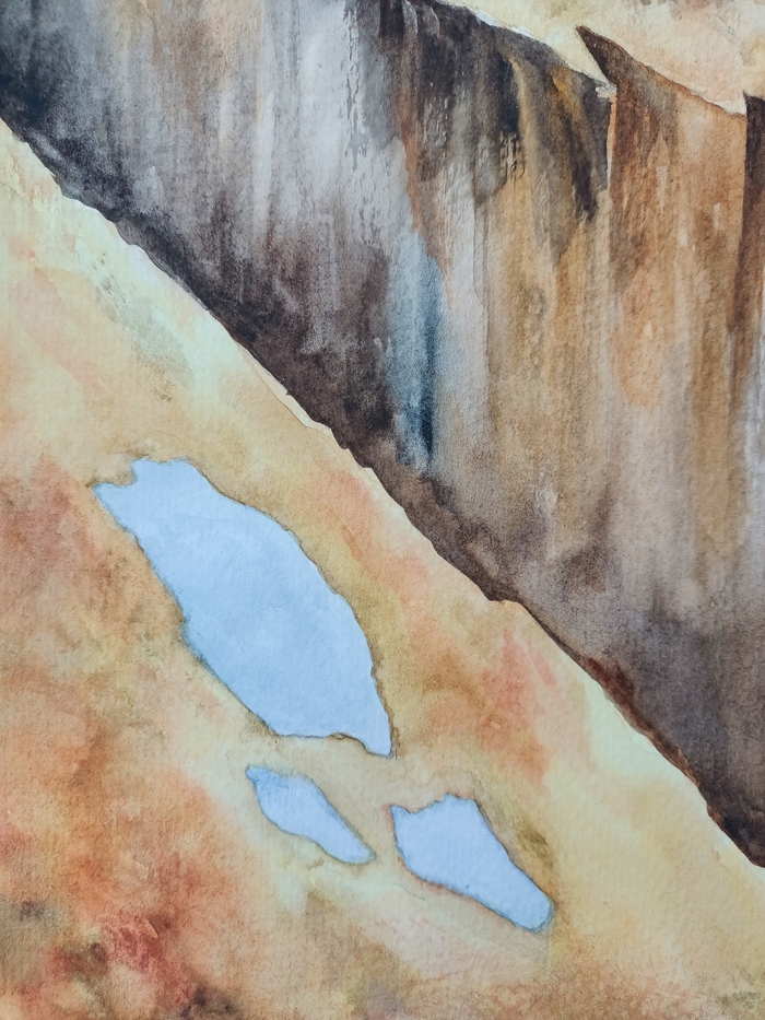 Акварель 30*30 см, бумага. Все, что осталось от моря - пара лужиц. Но семейство не отчаивается и ищет свое райское место, ведь они слышали, что оно есть.