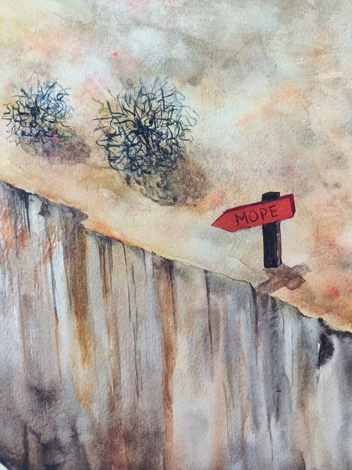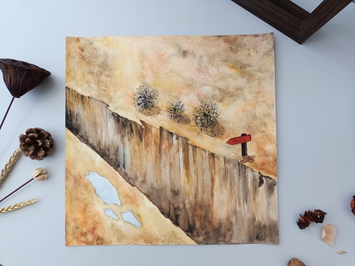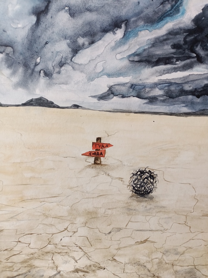 Картина акварелью на картоне, оформлена в раму. Размер 30*30 см. Логически это третья картина серии, где герой вспомнил о том, что у него есть семья и теперь не знает куда идти, чтобы ее найти. Точнее он даже не знает, живы ли они (спойлер: конечно да)). И вот он стоит перед выбором.