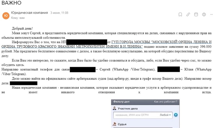 В июле 2024 года мне приходит на почту письмо от каких-то юристов по арбитражным делам о том, что на меня подали в суд за нарушение авторских прав и они готовы мне помочь с моим делом. Думаю, многие селлеры на маркетплейсах сталкиваются с подобным и потому знают, что таким часто промышляют мошенники, которые на шару пишут всем подряд и просят денег. Я знал что бывают мошенники от многих других селлеров и потому не придал особого значения, т.к. я то все делаю честно. Я плачу все налоги, мои товары ввезены в РФ в белую со всеми таможенными пошлинами, имеют сертификаты и т.д.