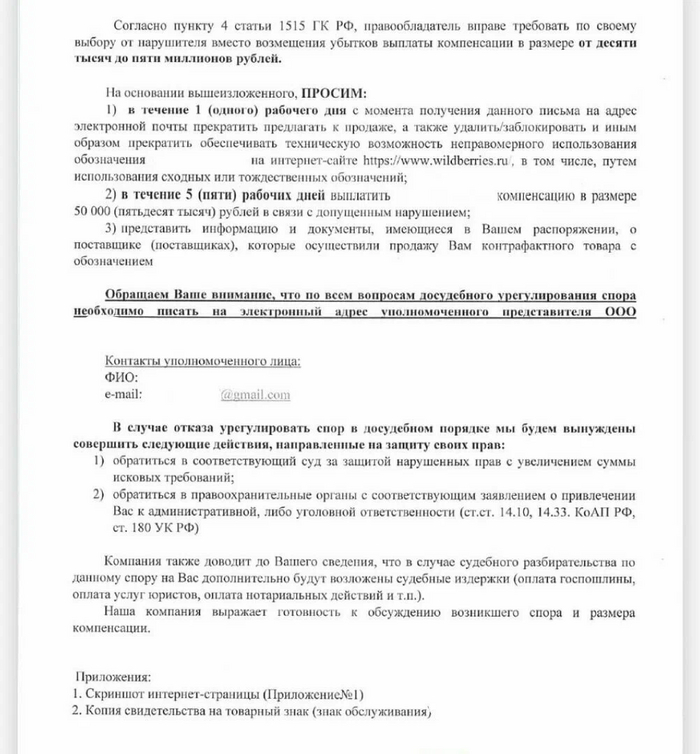 И так, вам в личный кабинет продавца Вайлдберис пришло обращение правообладателя, который сообщает, что вы нарушаете его права на товарный знак, просит прекратить продажу и скорее всего сразу попросит выплатить определенную сумму компенсации.