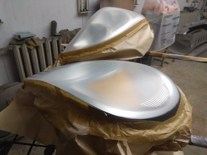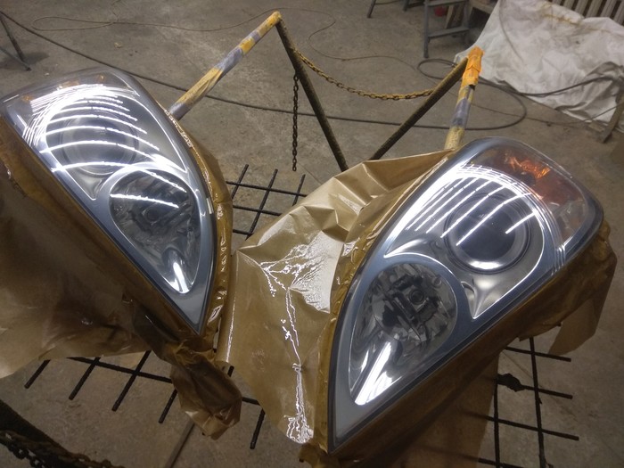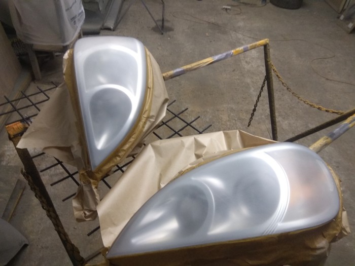 Если же защитный слой уже пробит временем и предыдущими полировками, то есть ещё вариант - покрыть фары лаком. Вот на этом и заострим внимание. Я давно знал этот способ, но не вникал в детали, т.к. был сторонником полировки. Но попались мне фары с убитым защитным слоем и настало время изучения альтернативных вариантов))) пересмотрев много видео и проведя несколько экспериментов на старых фарах, для себя вывел такой способ: шлифмашинкой зачищаем плоскость фары, нам нужно удалить защитный слой полностью, иначе лак может подняться или растрескаться, я использую зачистные круги 220-320-500-800, последним я использую 1000 на мокрую, далее оклеиваем то, что не будем лачить и вперёд)