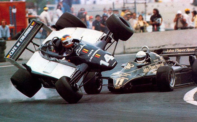 На седьмом круге Герреро ошибся и слишком широко вошёл в поворот. Его главный преследователь, Элио де Анджелис на Lotus, бросился в атаку, но пилот Ensign перекрыл ему траекторию. Машины столкнулись, Ensign подбросило в воздух. После приземления машина Герреро перегородила трассу. Де Анжелису, Массу и Уотсону удалось избежать столкновения и продолжить движение, а вот Патрезе вылетел и врезался в стену. Его Brabham загорелась, что заставило маршалов вывесить красный флаг.