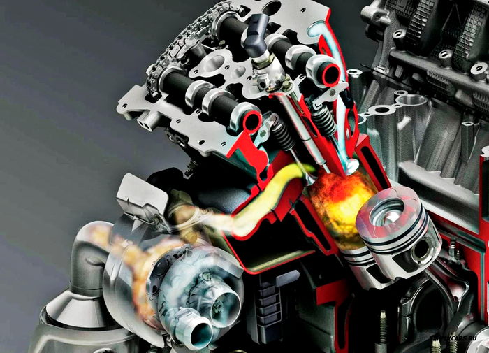 Бензиновый двигатель работает по циклу Отто. Топливо смешивается с воздухом заранее, затем сжимается поршнем и поджигается свечой. Степень сжатия - около 10:1. Процесс быстрый, взрывной. Мотор любит обороты, потому что на высоких оборотах успевает сжечь больше топлива за единицу времени - отсюда мощность.