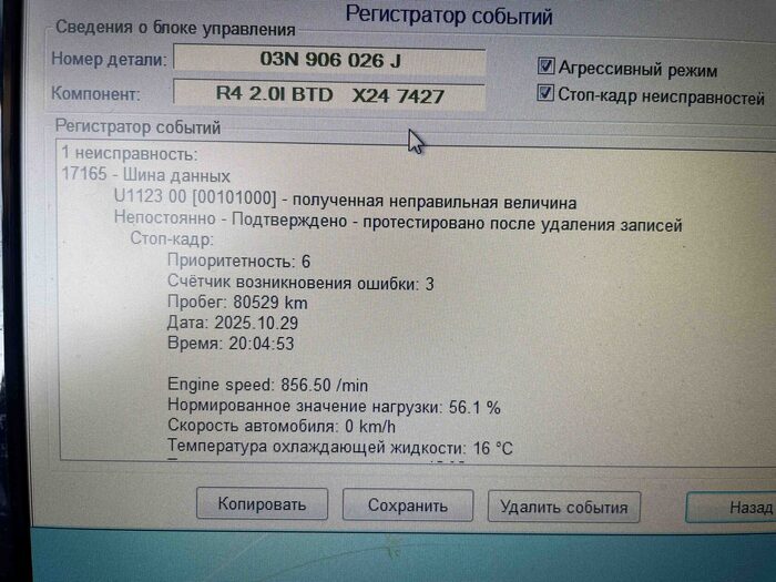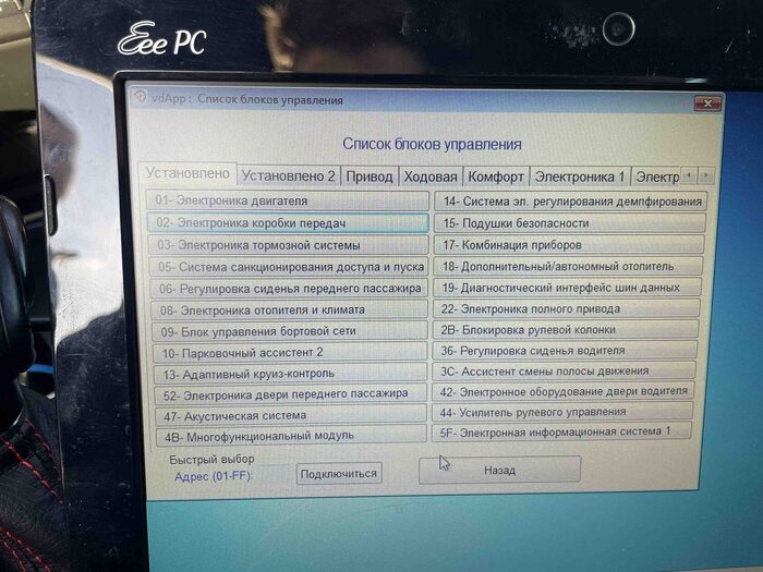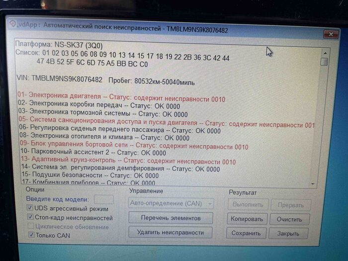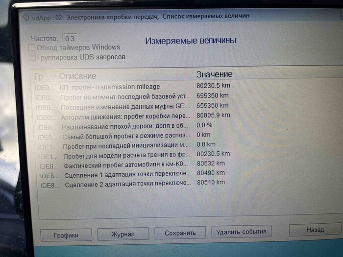 Как я уже сказал, менеджеры салона, как правило, говорят всю правду по автомобилю, и на этот раз исключения не было. Менеджер нам сразу сказал, что автомобиль, скорее всего, имеет скрученный пробег. Хотя по телефону менеджер нашему клиенту ничего подобного не сказал. Поэтому подключаем сразу VCDS и читаем пробег и ошибки.