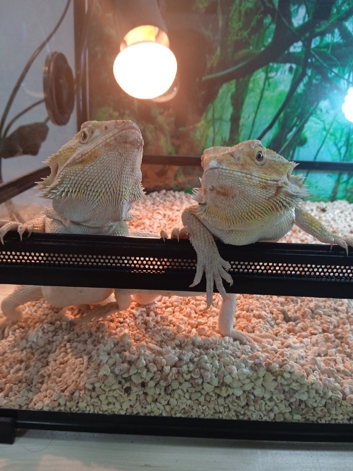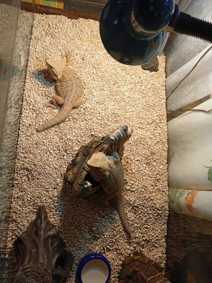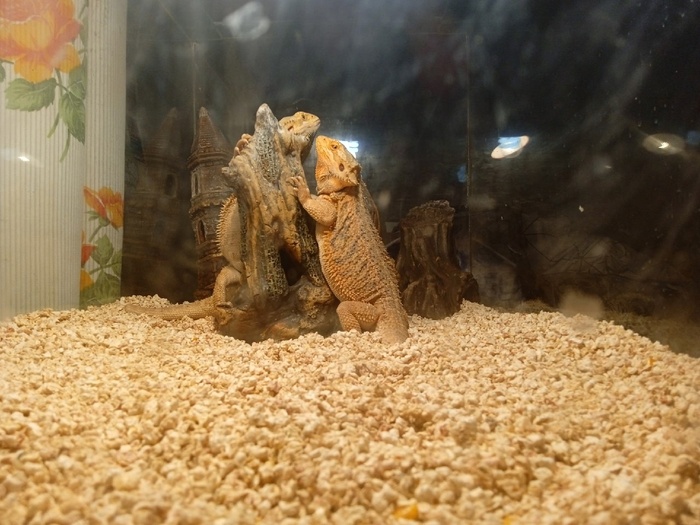 В общем, стали с нами агамки жить. Самочка и самец, по полгода им тогда было. А потом мы купили дом в Волгоградской области. Октябрь на дворе. А ехать надо. В общем, загрузились в грузопассажирскую газель. Кота в кузов, вместе с мебелью, и запасом тараканов, собаку и ящериц в салон. Посадили в обычный пластиковый контейнер. Ехали весело, долго, больше суток, но доехали. Сразу, как приехали и зашли в дом вместе с продавцом, посадили их в террариум, подключили лампы, а потом приступили к осмотру нашего дома. Продавец смотрела странно.