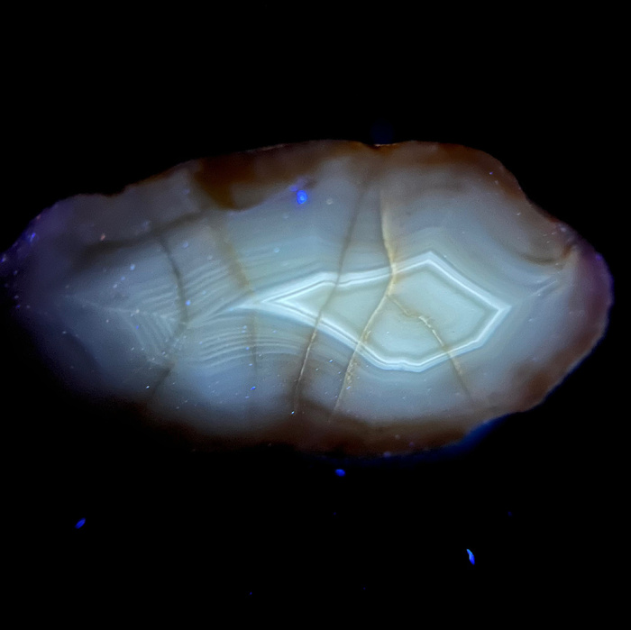 Даже несмотря на то, что в камне довольно много трещин, этот агат прекрасен! Цвета очень нежные, мягкие. Есть еще кое-что интересное в этом камне. Вы же помните, я посещала выставку минералов под ультрафиолетом? Конечно же, я приобрела себе УФ фонарик с длиной волны 365нм и стала разглядывать свои камни.
