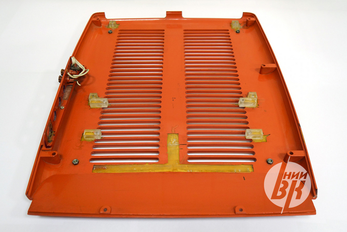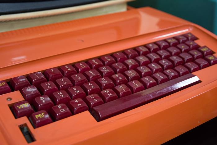 Возможно, именно поэтому не привлекла особого внимания оранжево-вишнёвая клавиатура (а на самом деле совсем не клавиатура), едва выглядывающая из-под большого матричного принтера.