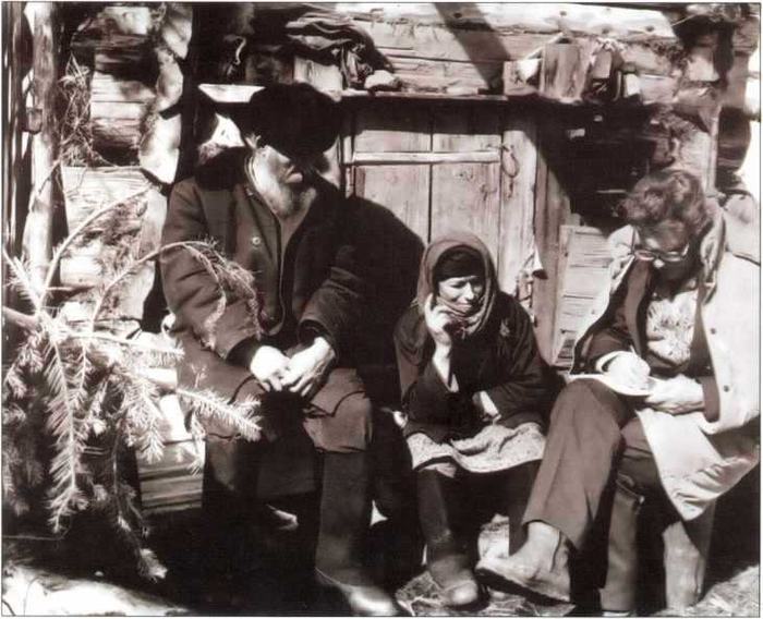 «Наш приход был, как видно, замечен. Скрипнула низкая дверь. И на свет божий, как в сказке, появилась фигура древнего старика. Босой. На теле латаная-перелатаная рубаха из мешковины. Из нее ж — портки, и тоже в заплатах, нечесаная борода. Всклокоченные волосы на голове. Испуганный, очень внимательный взгляд. И нерешительность. Переминаясь с ноги на ногу, как будто земля сделалась вдруг горячей, старик молча глядел на нас. Мы тоже молчали. Так продолжалось с минуту. Надо было что-нибудь говорить. Я сказала: