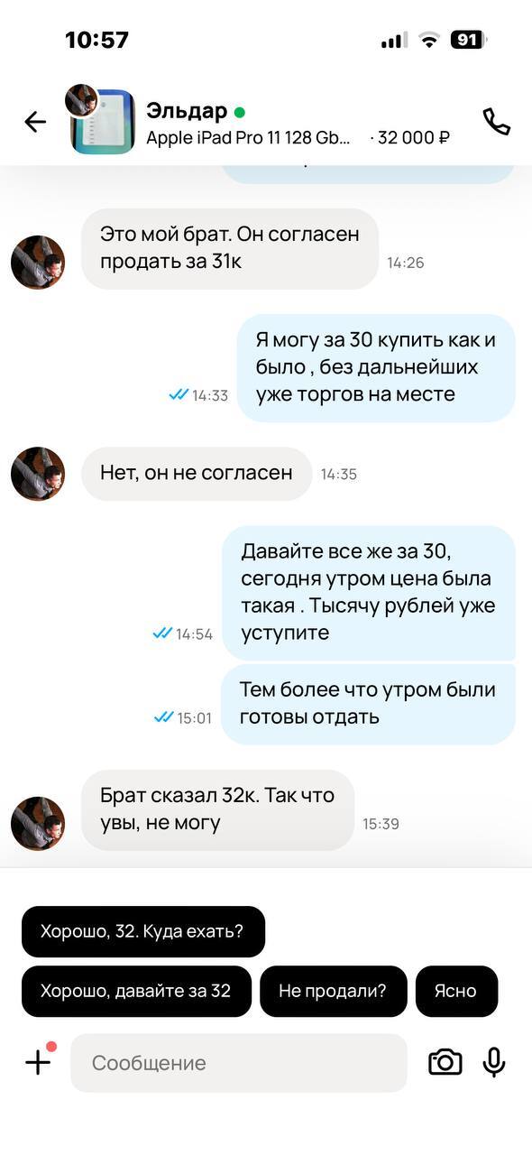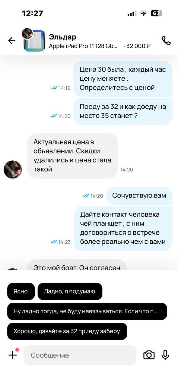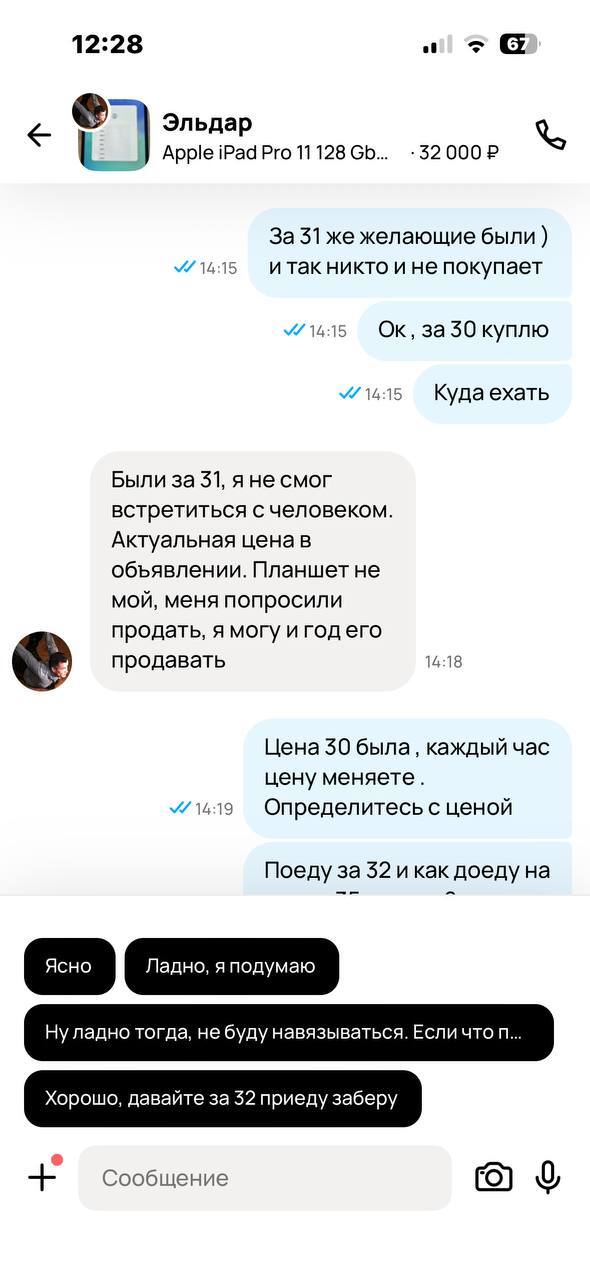Планшет был выложен месяц с имеющимися дефектами,а именно:Был заменен экран,пыль под камерой,скол на корпусе,не рабочий FaceId. За объявлением я следила,так как знала что цена высокая,а именно выше рыночной. Торговаться и просить скинуть мне 10 тысяч нагло. Поэтому добавила в избранное и ждала понижение. И вот он тот самый день. Спустя месяц цена на товар 30.000. Я ему сразу написала,и решила спросить про скидку в 10%.Так как планшет надо ещё ремонтировать,вкрывать,чистить пыль по камерой,меня датчик FaceId.Я делаю все это сама,поэтому ремонт обойдётся в районе 7-8 тысяч. Я ему предложила сделать скидку в 10% (27.000) так как даже авито за продажу доставкой берет 7%.Думаю если не согласится даже на символически торг на дорогу,так как до него добираться на машине без пробок час,заберу за полную стоимость как в обьявлении,на тот момент цена была 30.000.