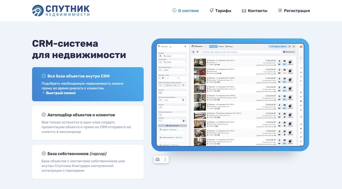 5. Спутник недвижимости – профессиональная CRM для работы агентств недвижимости. Обладает обширным функционалом и качественной технической поддержкой. В системе есть интересная функция – это чистка фотографий от водяных знаков с популярных сайтов, что может быть очень полезно для компаний, который только набирают объектовую линейку. Удобно сделан поиск объектов, есть поиск на карте и много различных интеграций со сторонними сервисами.