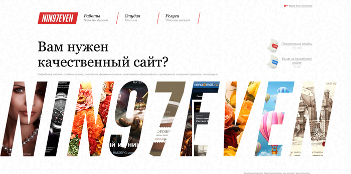 На дворе 2010 год — открывается студия Nineseven. Звучит красиво: я открыл студию, но реальность была не такой помпезной. Мое агентство состояло из трех человек, моей девушки, ставшей менеджером, и друга, до этого работавшего на радио. Друга я научил работать с Photoshop, чтобы он делал внутряки к дизайн-концептам.