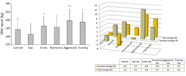 Грустные и юмористические клипы не оказали статистически значимого влияния, тогда как агрессивные, тренировочные и эротические ролики усиливали секрецию тестостерона, и увеличили вес, с которым они могли сделать присед 3 раза.