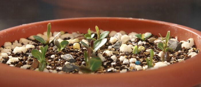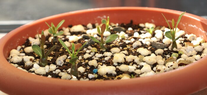 Здесь в центре взошло подарочная семка тайской смеси обесумов, которая приехала с криспумами - сажала по нормальному, как и положено сажать семена адениумов - просто закопала на 2 см глубины: