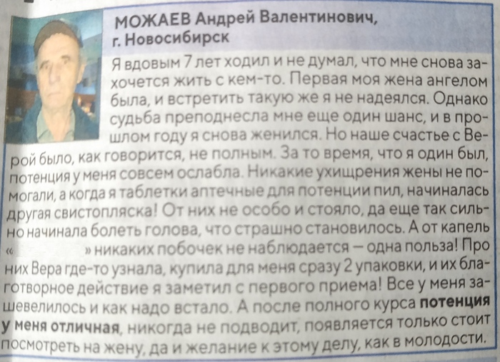 Бабушке в провинциальном городишке принесли газетенку с отзывами о БАДах.