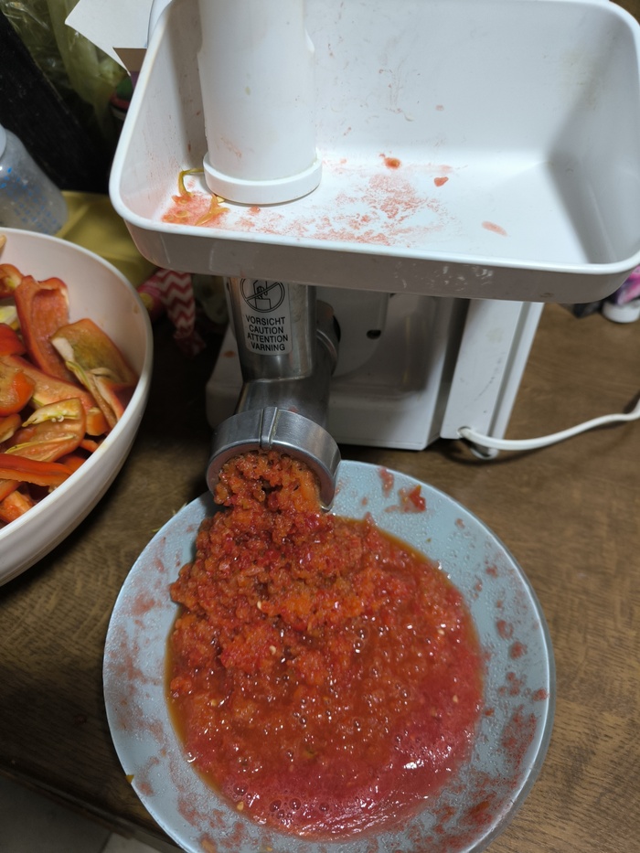Измельчите нарезанный перец, также измельчите чеснок. Добавьте специи к тёртой массе, а в конце посолите (я использовала около 100 г соли, вы можете регулировать по вкусу) и хорошо перемешайте.