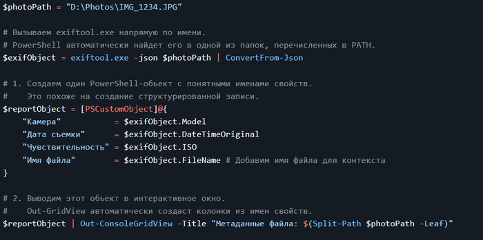 > $reportData | Out-ConsoleGridView -Title "Метаданные файла: $($photoPath | Split-Path -Leaf)"