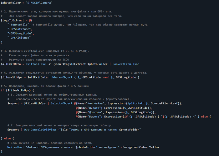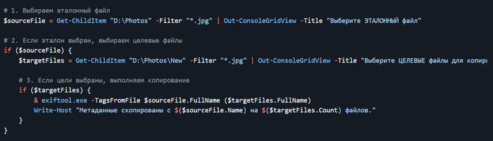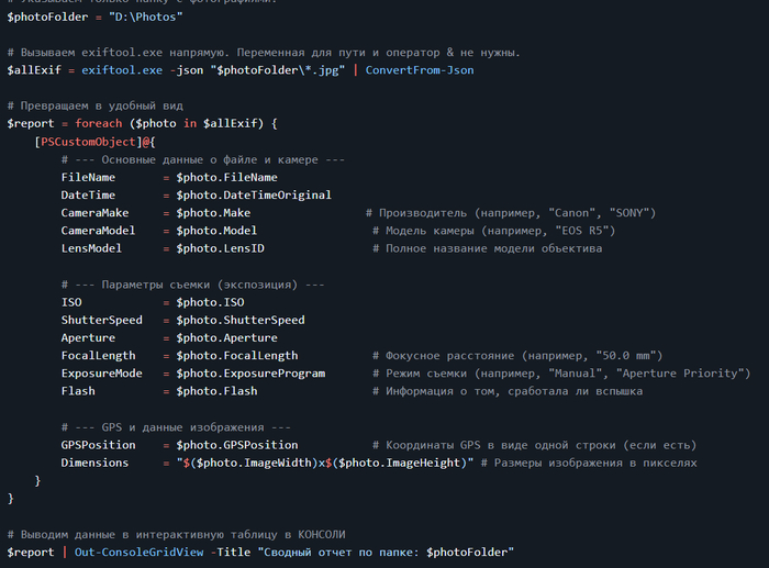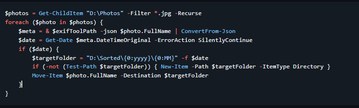> $exifToolPath = "C:\Tools\exiftool.exe" $photoFolder = "D:\Photos" # Переименуем в формат YYYY-MM-DD_HH-MM-SS.jpg & $exifToolPath -r -d "%Y-%m-%d_%H-%M-%S.%%e" "-FileName<DateTimeOriginal" $photoFolder